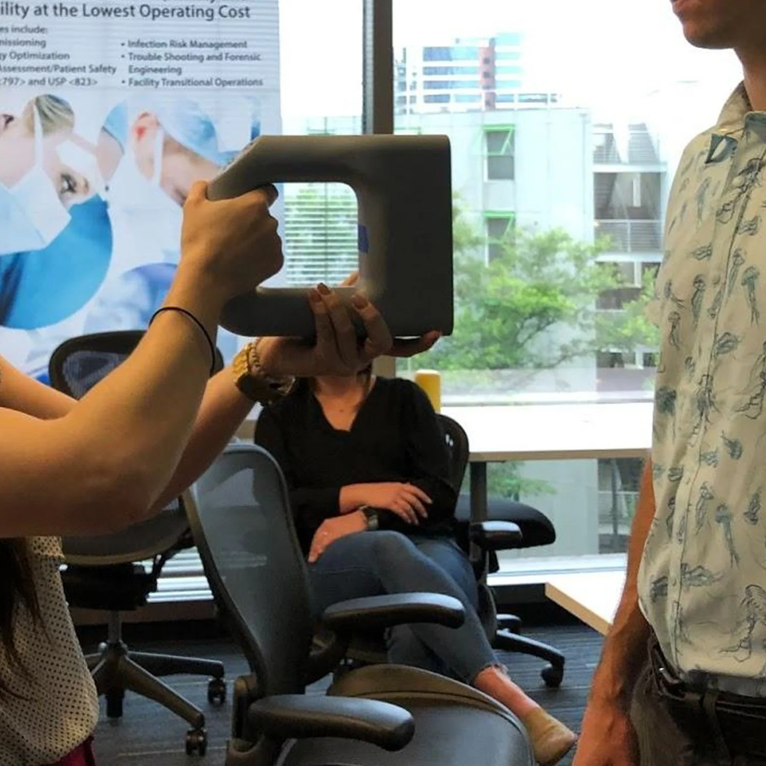 Most X-rays are taken overhead and from the side. Consulting a radiography technician and hand surgeon identified ideal holding positions, like a water kettle or joystick.